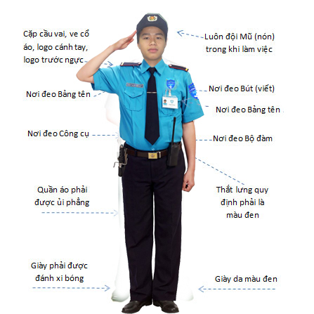 Đồng phục phải luôn sạch sẽ, phẳng phiu, đúng quy định của công ty. Phù hiệu, cấp hiệu đeo đúng vị trí. Giày dép đen, sạch sẽ. Trang bị hỗ trợ như đèn pin, dùi cui, bộ đàm (nếu có) phải được giữ gìn và mang theo đầy đủ. Trang phục chỉn chu thể hiện tính kỷ luật và sự tôn trọng đối với công việc và khách hàng.